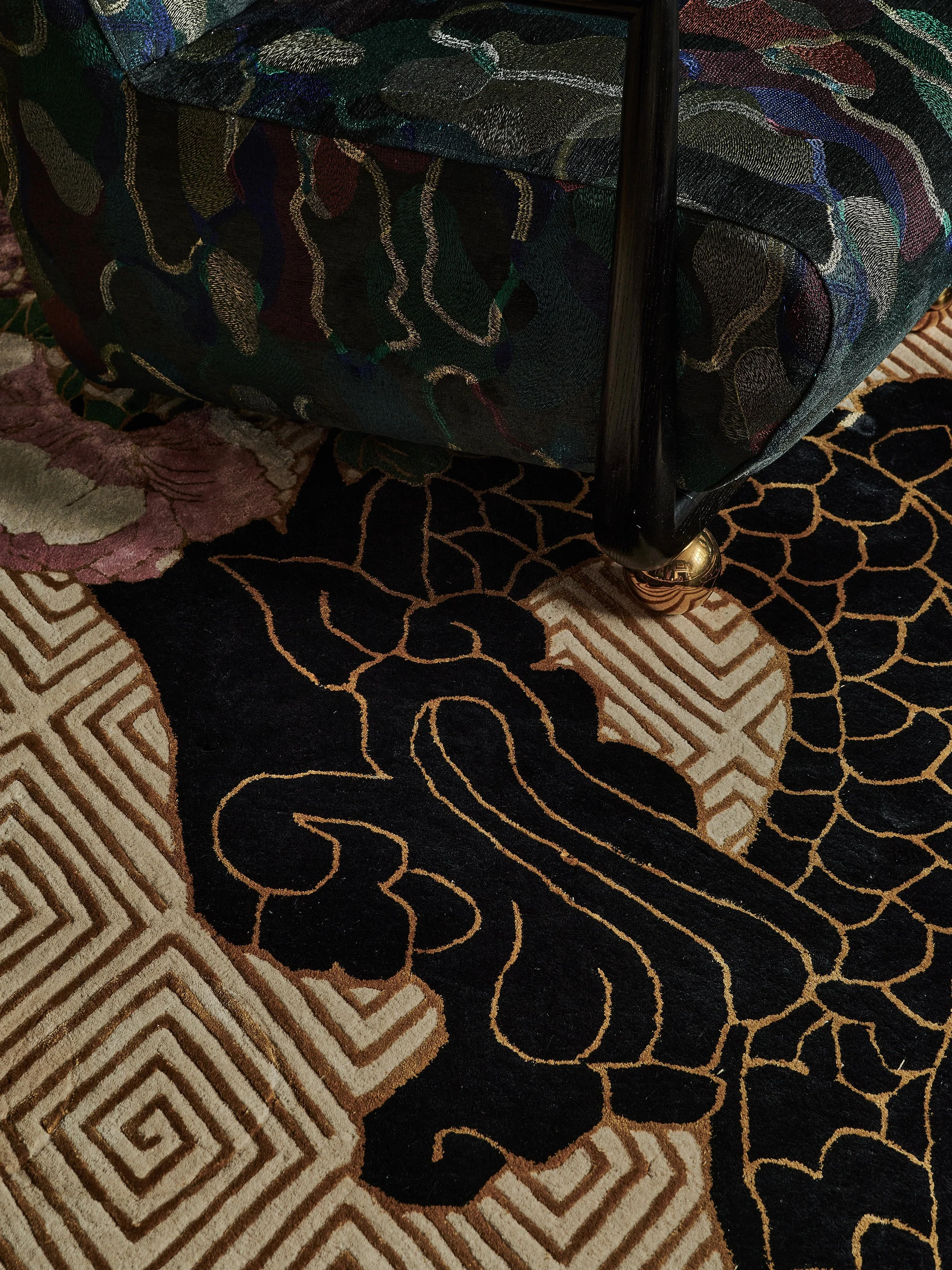 We designed a number of wonderful bespoke pieces that are both meaningful to our clients and functional for the space. The ‘disco bar cabinet’ is a beautifully detailed show-stopper piece with an Asian twist. The console and coffee table are bespoke WOOLF creations inspired by organic shapes and contemporary materials, the rugs are designed to add layers of pattern, warmth and originality.